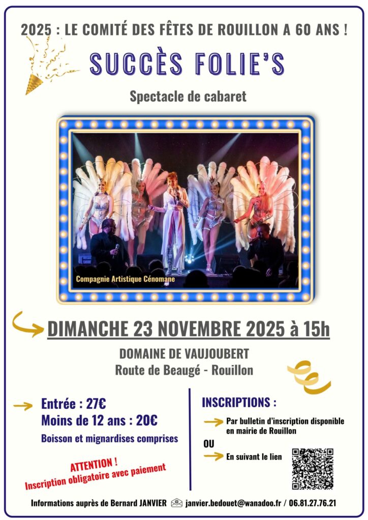 Pour les 60 ans du Comité des Fêtes, la Compagnie Artistique Cénomane vous présente son spectacle “ Succès Folie’s ”. De la chanson, de la danse et de la bonne humeur pour passer un agréable après-midi. Ce show musical et humoristique aura lieu le dimanche 23 novembre au domaine de Vaujoubert.